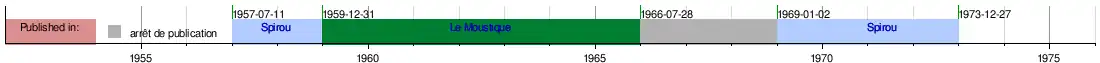 The series, first published in Spirou between 1957 and 1959, was then transferred to Le Moustique between 1959 and 1966 before the gags appearing in Le Moustique were republished in Spirou and its Dutch-language edition Robbedoes from 1969 to 1973. In parallel, the series was published in four paperback editions, then reissued as a complete series in the 1980s and 90s, as well as in November 2011.[2]
