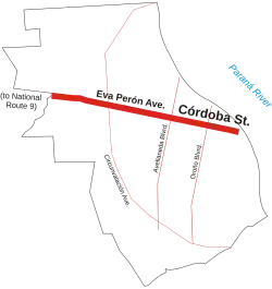 The street continues west and passes by the Patio de la Madera complex (which includes a park and lecture rooms employed for congresses and exhibitions) and the Bus Terminal. Later on, upon crossing Avellaneda Boulevard, it changes its name to Eva Perón Avenue.