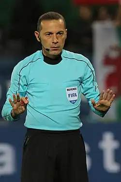Cüneyt Çakır (Turkish pronunciation: [ˈd͡ʒynejt ˈt͡ʃakɯɾ], born 23 November 1976) is a Turkish former football referee. He is best known for refereeing the 2015 UEFA Champions League Final between Juventus and Barcelona. He was FIFA listed since 2006 and a member of the UEFA Elite since 2010 until his retirement. He is currently serving as head of the Refereeing Department of the Georgian Football Federation.[1]