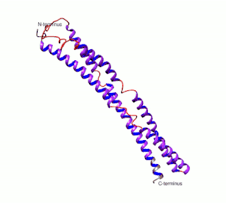 Predicted tertiary structure for C12orf60 protein by I-TASSER.[13] The amino acid termini are labeled. Regions located within DUF4533 are colored red if it is a coiled-coil and purple/blue if it is an alpha-helix. Otherwise, coiled-coils are colored grey and alpha-helices are colored gray/blue.