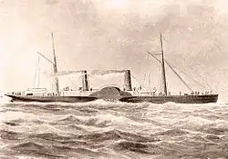 The CSS Colonel Lamb had a length of 281, a beam of 36, and a draft of 10, and was one of the most famous and successful blockade runners in the Confederate States Navy. She was built in 1864 by Jones, Quiggin & Company, a sister ship to the CSS Hope (which preceded it that year) but with a much longer house and without the usual turtle foredeck that the Hope had. She is identified with the handsome Captain Tom Lockwood and was christened by his wife. Shipbuilder Wiliiam Quiggin registered CSS Colonel Lamb in her name and then quietly transferred her to Confederate agent J. B. Lafitte, CSN in Nassau, where she was outfitted. She survived the war intact and was sold through Fraser, Trenholm & Co. to the Brazilian government; After loading a shipment of explosives for Brazil into Liverpool, she exploded at anchor in the river Mersey the night before setting sail.[1]