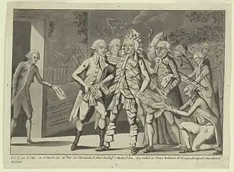 L'Homme aux assignats, November 1791 caricature of Armand-Gaston Camus, deputy and commissioner of the Caisse de l'Extraordinaire, represented in a suit made of assignats which are grabbed by greedy political insiders: from left to right, Antoine Barnave, Charles Lameth, Claude Fauchet, Isaac Le Chapelier, François-Valentin Mulot, Jacques Brissot (kneeling), and Claude-Emmanuel de Pastoret. On the far left, an impoverished army veteran (vieux militaire) begs for payment of his pension and is told to "go have dinner with your friends" (allez dîner chez vos amis).[8]