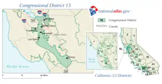 California's 15th congressional district is a congressional district in the U.S. state of California. The district is currently represented by Democrat Kevin Mullin.