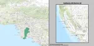 The congressional district is located in the southern portion of the state and includes part of Los Angeles County.[3] The district's current borders are delineated by the 110 freeway in its western border and takes an inward right following the 105 Freeway. Following S. Central Avenue north, it then zig-zags its way to Florence Ave at its apex. Its eastern border runs mostly along the 710 Freeway until reaching the Pacific Ocean.