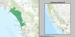 Under the 2020 redistricting, California's 49th congressional district is located in Southern California, covering the North County region of San Diego County and southeast Orange County. The area in San Diego County includes the cities of Carlsbad, Oceanside, Encinitas, Solana Beach, Del Mar, and Vista; and the census-designated places Camp Pendleton Mainside and Camp Pendleton South. The area in Orange County includes the cities of San Clemente, San Juan Capistrano, Dana Point, and Laguna Niguel; and the census-designated places Ladera Ranch, Las Flores, and Rancho Mission Viejo.