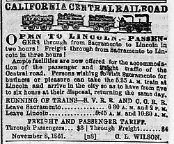In 1862, California Central had two locomotives in service between Folsom and Lincoln — the "Lincoln" and the "Harry Wilson"— one in Sacramento yet to run — the "Garibaldi" — and one on order.[20] As the northern terminus of CCRR, the new town of Lincoln showed signs of growth.[21] Even so, CCRR was never able to complete its road to Marysville.