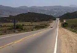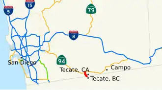 A road from the town of Potrero to Tecate existed by 1917.[10] The Tecate border crossing originally opened in 1932.[2] In 1938, the San Diego County board of supervisors proposed moving rerouting the road to be shorter and on more level ground, although there was opposition from local residents and businesses who favored the old road.[11] However, the route of the road to Tecate has remained the same since then.[12][13]