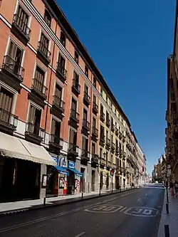 Created in the Middle Ages it originally connected the alcázar with the Puerta de Guadalajara (a disappeared wall gate).[2] The Calle Mayor, that borders the Plaza Mayor to the North, became the main thoroughfare of the city in the Early Modern Period.[3] The Calle Mayor was the place where the guilds of silversmiths and jewelers concentrated.[4] In the 18th century, the street was divided in three sections with different names: Almudena (from the alcázar surroundings to the Plazuela de la Villa; Platería (from the plazuela de la Villa to the Puerta de Guadalajara), and Mayor (from the Puerta de Guadalajara to the Puerta del Sol).[5][6]
