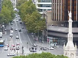 Calle de Génova as viewed from the Plaza de Colón. The Torres de Colón dominate the right of the photograph, while the sculpture Woman with Mirror can be seen on the pedestrian island at the end of the road.