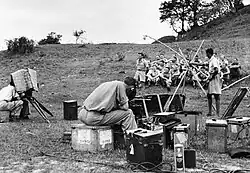 The equipment used by both studio and location units was broadly the same; 35mm camera, film and sound equipment. In 1945 the cumbersome separate sound camera was replaced by a sound-on-film camera similar to those used for newsreels. The studio had a permanent complement of staff consisting of Indian as well as British personnel. The location unit usually comprised a director, two cameramen, two sound recordists, two assistants and a welfare officer responsible for making the contacts. At least one of the location units operated as part of the Army Kinematograph Service (AKS) and had been sent out from the UK to assist.[1]: 33 [3][4]