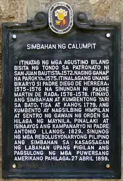 Calumpit was established as a prior on May 3, 1572, along with the churches of Lubao and Betis. On March 3, 1575, Fray Gaspar de San Agustín did not provide the town's first vicar. The convento of Calumpit was established on December 28 of the same year with the towns of Candaba and Macabebe annexed to it as its visitas. Its first titular patron is Saint Nicholas of Tolentine, but on December 31, 1576, its convento was referred to as La Casa de San Juan Bautista.