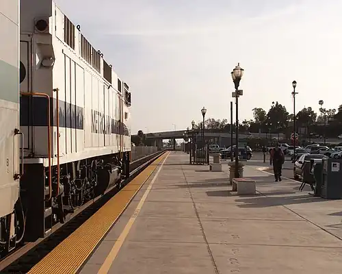 Camarillo station is a passenger train station in Camarillo, California. Amtrak's Pacific Surfliner between San Luis Obispo and San Diego and Metrolink's Ventura County Line between Los Angeles Union Station and Ventura–East station stop here. It is located at the foot of Ventura Boulevard at the intersection of Lewis Road, and is underneath the US Highway 101 overpass. A lengthy pedestrian overcrossing must be used to transfer between the platforms so a shorter tunnel route is planned.[4] The first Camarillo depot was at this same location until Southern Pacific ended passenger service.