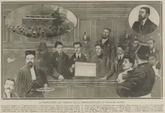 The first trial against a Camelot du Roi took place on 24 December: Serge Real del Sarte, a student at the Ecole des Beaux-Arts, was accused of "violence against an agent".[13] The same day, a group of 500 demonstrators, led by his brother Maxime and the Camelots, headed for the Senate and invaded the courtyard of the palace to cries of "Down with the republic!" to make themselves known. The Camelots du Roi did not hesitate to be voluntarily arrested in order to appear in a public trial and to get press.