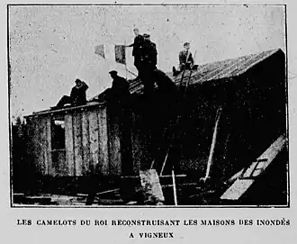 During the 1910 Seine flood, the Camelots du Roi helped the victims in various ways: soup kitchens, distribution of coal and clothing, ferries to cross or bring the victims to safety, collection of donations.[17][18][19] The Camelots du Roi imagine themselves "in the most working-class neighborhoods, in the reddest suburbs of the outskirts with a certain guts, sometimes expelled by a stubborn police commissioner, as in Javel, or by a mayor [...] like in Issy-les-Moulineaux ».[19] In the suburbs of Issy-les-Moulineaux, the Action Française soup kitchen provided a thousand meals a day and the Camelots du Roi provided regular assistance to 172 families for a total of 882 people.[20] Maurice Pujo gives an account of these events in the Almanach de l'Action française of 1911.[21] From February 17 to April 20 in Vigneux, the Camelots du Roi build and furnish twenty-five barracks for workers, with the help of the Marquise de Mac Mahon and the Association of Young Royalist Girls.[19]