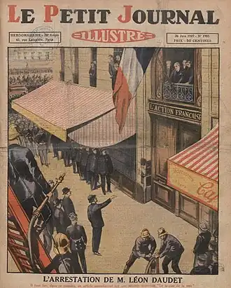 In 1927, the Camelots du Roi actively participated in the protection of Léon Daudet and Joseph Delest when they were ordered to serve a prison sentence following the complaint of the taxi driver Bajot quoted in the Philippe Daudet Affair.[48] From June 9, 1927, Léon Daudet took refuge in the premises of Action française, rue de Rome, to evade justice. The Camelots du Roi and the leaguers barricaded the place like Fort Chabrol. After three days of siege which gave rise to major fights with the police, the prefect Jean Chiappe obtained the surrender of the two main madmen, who were immediately imprisoned in the prison de la Santé. On June 25, 1927, the telephonist Charlotte Montard escaped Léon Daudet, Joseph Delest and the communist Pierre Semard thanks to a hoax telephone call to the Director of the prison. For this plan, Charlotte Montard delegates to a dozen Camelots du Roi, including André Real del Sarte and Pierre Lecœur, the responsibility of saturating the prison telephone lines.