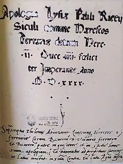 5. ^ Apologia Lysiae Pauli Riccii Philaeni Siculi nomine Haereseos Ferrariae detenti Hercule II Duce III foeliciter imperante anno 1540, ms B 1928, f. 53v.