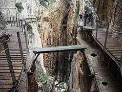 El Caminito del Rey (The King's Little Path) is a walkway pinned along the steep walls of a narrow gorge in El Chorro, near Ardales in the province of Málaga, Spain. Its name derives from the original name of Camino del Rey (King's Pathway), abbreviated locally to el caminito.[1] The walkway was constructed in the early 20th century, but by the early 21st century, it had fallen into disrepair and was partially closed for over a decade. After four years of extensive repairs and renovations, it re-opened in 2015. It has been described as the "world's most dangerous walkway" following five deaths in 1999 and 2000.[2] The most dramatic accident was when three men from El Chorro tried to cross by means of a zip line to a train line at the other side of the gorge. The cable could not stand the weight of the three men, and it broke.[3]