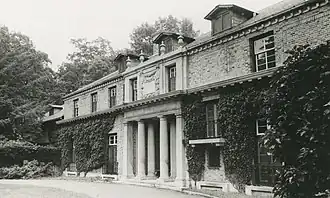 Camp-Woods, is a historic estate with associated buildings located at Villanova, Delaware County, Pennsylvania and built on a 400 ft (120 m) high spot which had been a 200-man outpost of George Washington's Army during the Valley Forge winter of 1777–78.[2] The house, built between 1910 and 1912 for banker James M. Willcox, is a two-story, brick and limestone, F-shaped house in an Italianate-Georgian style. It measures 160 ft (49 m) in length and 32 ft (9.8 m) deep at the "waist." It has a slate roof, Doric order limestone cornice, open loggia porches, and a covered entrance porch supported by Doric order columns. The house was designed by architect Howard Van Doren Shaw (1869-1926). The property includes formal gardens.[3] Its former carriage house is no longer part of the main estate. The original tennis court is now also a separate property named "Outpost Hill". The Revolutionary encampment is marked by a flagpole in a circular stone monument at the north-western edge of the property. The inscription reads, "An outpost of George Washington's Army encamped here thro the winter of Valley Forge 1777-1778".