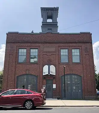 In 1908, after an initial two-year dormancy over funding, the Camp Curtin Fire Company No. 13 was formally activated and $2,000 were allocated by Harrisburg City Council for the purchase of the lot on the corner of Sixth and Ross Streets for a one-story frame building.[3] This was quickly outgrown, and two-story, twin-bay Camp Curtin Fire Station was built in 1910.[4][5] The rectangular brick building measures 38 by 46 feet (12 by 14 m) and exhibits Italianate style design elements. It features a square wooden bell tower at the center of the front façade. The tower has a hipped, shingled roof and four stilted segmental arches.[6]