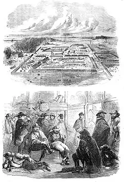 Dr. Edward D. Kittoe of the surgeon general's office inspected the camp on January 18, 1864.[128][129] He found the severely overcrowded barracks deep in filth and mud, and swarming with vermin due to the lack of flooring.[128] Cooking was deficient and garbage littered the streets.[128] Old sinks (latrines) were not sealed properly and waste was seeping to the surface.[128] Dr. Kittoe gave high marks to the hospital but noted that 250 sick men remained in barracks because the hospital's 234 beds were full.[130] He found that thirty-six percent of the prisoners were ill, and fifty-seven prisoners had died in December 1863.[130] The guards also were suffering from the poor conditions at the camp, with twenty-nine percent ill and six deaths among them in December 1863.[130] Dr. Kittoe concluded the camp was unfit for use, but it remained in use.[130]