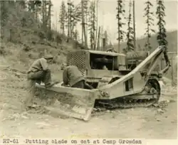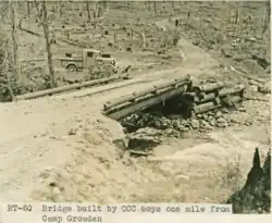 November 14 saw Lieutenant Commander Clarence L. Bradfield commanding the new 184-man Company 950 had arrived and settled into camp. The company had been relocated from Camp Sullivan Lake in Idaho. The main tasks for 950 would be road building, stringing telephone lines, hazard mitigation and replanting trees. A small 16-man contingent was split out to "spike camp" in Republic. The group was bunked at the Republic ranger station and tasked with continuing Camp McMann tasks such as finishing building two houses for Rangers and a rockery wall.[19] Two major road building projects were taken up by the 950 in November, with the continuation of Barnaby Creek road around Barnaby Butte and connecting Sherman Creek road to the Lake Ellen area in the southeast corner of the national forest. They also started work on the new Skalawag Ridge road, running up from the South Fork Sherman Creek road to the Skalawag Ridge lookout[20] on top of the mountain overlooking Camp Growden.[7] In camp itself, general clean up work accompanied drainage field construction and sidewalk installation.[20] By December 19, 4 mi (6.4 km) of the Skalawag Ridge road had been completed, with CCC personnel estimating it would be finished by January 1935. With snow coming into the region, telephone line work towards Stahley and White Mountains would continue as long as snow allows, with 5 mi (8.0 km) already finished. At camp, early land clearing work was started for the proposed Lake Sherman with about 8 acres (32,000 m2) being impacted. The Republic spike camp was moved into winter housing there and prep work had started in Kettle Falls to establish a similar spike camp situation. As with the Republic crew, the Kettle Falls men would be tasked with building a warehouse, several residences, and a ranger station.[21]
