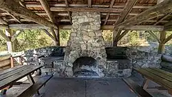 By the Spring of 1941, the camp complex included a number of buildings and maintained lawns alongside the now-full Lake Sherman. The campus included barracks, a recreation building, and storage buildings. Housed in the various buildings, the CCC facilities provided a mess hall, library, injury ward and dispensary, machine shop, and education room. There were free classes on various skills and hobby work like shortwave radio, photography, weaving and wood burning. The recreation hall was built to accommodate up to 200 people at a time and included pool tables and a fireplace. Off-duty time could be spent playing board and card games or watching the weekly movie shown in the hall.[12]