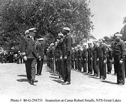 The camp was located inside the Great Lakes Naval Training Center in Illinois and named for Robert Smalls, a black naval hero of the American Civil War.[2] The camp's first commander was Lieutenant Commander Daniel Armstrong, whose father had founded the Hampton Institute and had "brought him up to understand race problems."[3] The Navy began enlisting Negro seamen on June 1, 1942, and the first class of 277 enlistees began training at Camp Robert Smalls later that month.[1] Of that class, 222 completed the training successfully on September 3, 1942. 102 of those graduates were chosen to continue with specialized training, and the rest of the class was assigned to routine duties.[4]