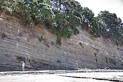 The land is primarily formed from clay and Waitemata sandstone, which can be seen in the cliffs along the coast.[8][9] Prior to human settlement, the inland Campbells Bay area was primarily a northern broadleaf podocarp forest, dominated by kauri, with significant numbers of tōtara, mataī, miro, kauri and kahikatea trees. Pōhutukawa trees were a major feature of the coastline.[10][11]