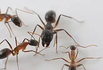 Trophallaxis - the mouth-to-mouth transfer of liquid food - is a main mechanism of food dissemination in ant colonies. In C. fellah, the colony trophallactic network has been quantified by combining unique marking of individuals with fluorescently labelled food. This procedure refined our understanding of trophallaxis, revealing that transfer flow can switch direction during a trophallaxis event, that foragers receive (as well as unload) food, that foragers often leave the nest after offloading only a small amount of the food in their crop, and that non-foragers also offload considerable amounts of food. Further, the vast majority of trophallaxis events were short in duration, possibly functioning to maintain the colony odour rather than disseminate food.[8] Indeed, when the hydrocarbon profiles of members of C. fellah colonies are artificially modified, the colony reaches homogeneity more rapidly than non-trophallaxing species.[9] Through maintaining homogenous hydrocarbon profiles, trophallaxis mediates colony cohesion. The engagement of workers in socially cohesive trophallaxis may be underpinned by levels of octopamine in the brain. Usually after isolation, upon return to the colony, workers perform trophallaxis at an elevated rate. However, if workers are treated with octopamine, this increase in trophallaxis is not observed.[10]