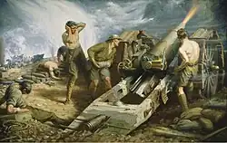Canadian Artillery in Action by Kenneth Forbes. It depicts gunners at their post while sustaining artillery fire during the Battle of the Somme.
