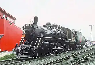 During its time on static display, No. 1392 was meticulously maintained by members of the Canadian Railroad Historical Association (CRHA) Rocky Mountain Branch, in order to remain as clean and presentable to the general public as possible.[3] In 1970, the locomotive was acquired by the recently formed Alberta Pioneer Railway Association (APRA), and the locomotive was thereafter moved from the exhibition grounds to the Association's nearby location at the Edmonton Transit Service (ETS) Cromdale Car Barn with the hopes of restoring it to operational status, and restoration work began in 1972.[4][2] Work was completed in 1974, and No. 1392 was fired up and moved under its own steam for the first time under private ownership.[4] The following year, 1975, the APRA relocated their equipment from the ETS car barn to a site that was part of CN's Coronado Subdivision.[4] The site was opened to the public two years later, with No. 1392 being one of the locomotives to be used to pull the museum's regular short-distance tourist trains.[4]