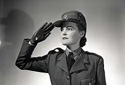 Official regulations regarding uniforms were that the women must wear a: "Khaki greatcoat, barathea skirt and hip-length jacket, peak cap with high crown, and a cap badge with three maple leaves on a stem on which was inscribed 'Canadian Women's Army Corps'. Helmeted head of Athene appears on buttons and badges."[4]