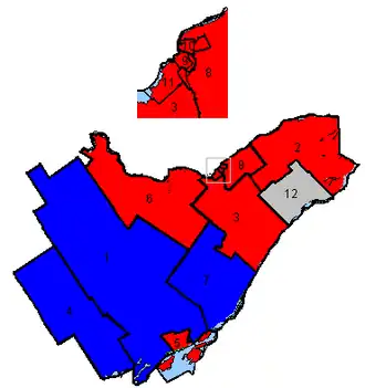 In the 2011 election, the region was affected by the nationwide surge in support for the NDP. Although the NDP failed to win any seats in the area, they increased their popular vote share in all seven of the region's ridings, and won second place in three of the area's ridings.