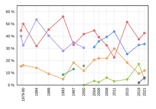 | Election | Liberal | Conservative | New Democratic | Green | PC | Reform / Alliance |