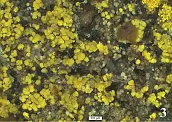 The lichen's algal partner (photobiont) belongs to the family Chlorococcaceae, with individual algal cells measuring 9–20 μm in diameter. Chemical analysis reveals that the species contains only pulvinic acid, which contributes to its characteristic yellow colouration.[2]