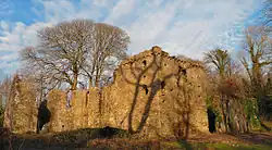 Candleston Castle, a fortified manor, was built in the 14th century. An enclosure, in the shape of a D, surrounded the structure.[5][6] The late-medieval manor may have been constructed on the site of a previous building, based upon the presence of remnants of an earlier wall.[2] The castle may have been built by Robert de Canteilupe III, who owned one ploughland at Candleston in 1320 according to the Despenser Survey of Glamorgan of that year.[7][nb 1] Robert III, who is not recorded after 1320, may have been succeeded by John de Cantilupe, who may have been the Abbot of Margam in 1315.[7][nb 2] Robert de Cantilupe III's daughter Joan, heiress of Candleston, married Sir William Horton of Tregwynt, Pembrokeshire.[7]