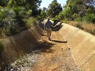 The Canning Contour Channel is a 16-kilometre (9.9 mi) series of human-made concrete channels and steel and cast-iron pipelines in the Darling Scarp in Western Australia constructed between July 1935 and December 1936.[1] The project was a Depression era public works scheme to carry potable water from just below Canning Dam through the hills around and above Roleystone and Kelmscott to a screening, fluoridation and pumping station near Gosnells by following the natural contours of the Canning Valley – hence it was entirely gravity-fed. Where a tributary valley needed to be crossed, suspended or siphoning pipelines were used. From Gosnells, the water entered the city's pipeline distribution system.
