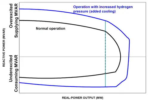 The D-curve for a particular generator can be expanded by improved cooling. Hydrogen-cooled turbo generator's cooling can be improved by increasing the hydrogen pressure, larger generators, from 300 MVA, use more efficient water cooling.[3]