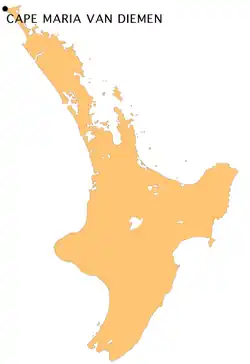 Cape Maria van Diemen is the westernmost point of the North Island of New Zealand. A tombolo, it was originally an island composed mainly of basaltic-andesitic lava flows and dykes.[1] Drifting sands joined it to the rest of the North Island during the late Pleistocene.