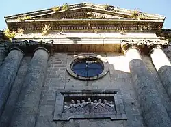 It has a single nave covered with a barrel vault, and three side chapels on each side, joined together, and the presbytery with the rectangular main chapel, narrower than the nave. The frontispiece is framed by two pairs of big columns with plain shafts and Ionic style capitals, standing on high pedestals. They support a flat entablature topped with a straight pediment.[1] The pediment is topped with two angels adoring the Cross. Inside, the side chapels are decorated with painted bas-reliefs showing scenes from the Passion of Christ (including the Way of Sorrows): from the Flagellation of Christ, the crucifixion to the resurrection of Jesus.