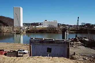 ![]() West Frankfort Connector Bridges under construction in 1988 (Capital Plaza Office Tower in the background to the left). | |