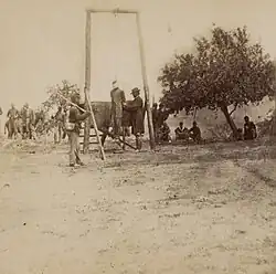 The Union Army executed at least 265 soldiers for military offences during the Civil War, including 147 for desertion.[22] Other sources suggest that the number of executions by the Union during the Civil War were more than 275.[23] Executions were not limited to Union military personnel but were also carried out as punishment for various wartime offences including for espionage and other crimes. According to the National Parks Service, there were nearly 1,000 military tribunals in which "Confederates, both regulars and guerrillas, were charged with various violations of the laws of war – mostly related to the treatment of prisoners of war".[24] One of the most famous offences committed during the Civil War, and tried under American military law, was the trial of the assassins of President Lincoln in 1865. Other military tribunals formed during, and after, the Civil War included: