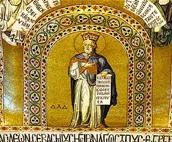 As an expression of Norman culture, St. Dionysius and St. Martin are represented in the sanctuary.[17] Mosaics are of Byzantine culture in their composition and subjects.[18] The apex of the dome consists of the Pantokrator, with rows of angels, prophets, evangelists and saints.[18] The Byzantine motif ends abruptly with scenes from Christ's life along the south wall of the southern transept arm, while the north wall consists of warrior saints.[18]