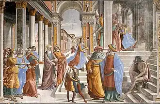 Two groups of Florentine people, representing the populace, are shown to the sides of the scene. They wear contemporary fashionable clothes (for which the frescoes are a famous source), unlike the main biblical figures, who wear the usual "iconographic costume". On the left, two figures may be identified as Lorenzo Tornabuoni, son of Ghirlandaio's patron, and Piero di Lorenzo de' Medici, the former's friend. In the righthand group is a self-portrait of the artist with some of his relatives. The loggia in the background could be a representation of the Ospedale di San Paolo (St. Paul's Hospital), which was then under construction in the same square as Santa Maria Novella. The two buildings on the sides are examples of typical edifices of 15th-century Florence, characterized by rustication and an upper loggia.