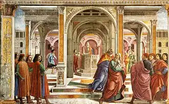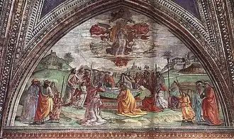 This scene was the one that Vasari, in his biography of Ghirlandaio, considered the best in the cycle, due to its dramatic and frantic composition. It is probable that Ghirlandaio was inspired by scenes of ancient Roman bas-reliefs, like that depicted on the arch in the background.