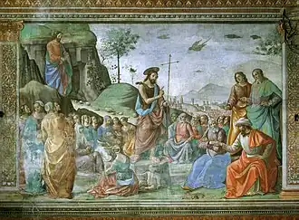 In this scene John the Baptist is portrayed in the centre, on a rock, while instructing a crowd who form a circle around him. He wears the camelskins mentioned in the Gospels and is pointing at the cross. A listening Jesus can be seen on the path in the upper left corner.