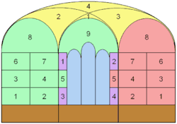 The cycle portrays on three walls the Life of the Virgin and the Life of St John the Baptist, the patron saint of Florence. The left and right walls each have three rows, each divided into two rectangular scenes framed by fictive architecture, and surmounted by a large lunette beneath the vault. Each side wall has a total of seven narrative scenes which are read beginning from the bottom.