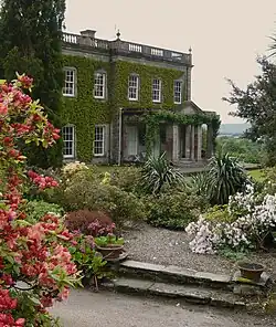 The landscaped gardens are the work of Lady Olivia Keane who, after years of neglect following World War II, designed the grounds. There are some fine trees, Japanese cedars, maples and a southern beech, and a venerable oak that is included in Owen Johnson's Champion Trees of Britain and Ireland. Higher on the slopes are terraces with rhododendrons, azaleas, camellias and magnolias, and everywhere, fine views over the surrounding countryside.[4]