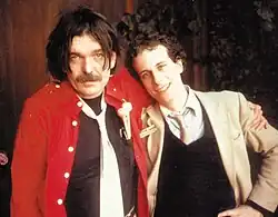 Van Vliet seated left on stage with Zappa in 1975 in their Bongo Fury tour