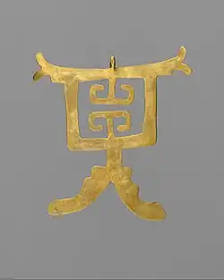 Their artwork was made out of materials such as wood, strings, and wool.[2] Their work sometimes took the form of shaft burials.[3][4] Their pottery reached important artistic development, being recognizable by its forms and decoration, emphasizing the negative painting or positive bicolor. Their jewelry work stands out for the large gold pectorals, nose rings, discs and plaques, all made with fine gold sheets and with complex geometric designs.